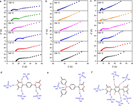 图2.(a-c)CTFs负载H3PO4后的质子传导性能测试; (d-f) CTFs与H3PO4相互作用示意图.