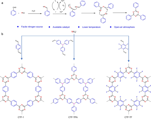 图1.(a)该反应合成三嗪环可能的机理示意图;(b)不同结构CTFs的合成。