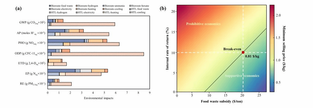 图1. (a)生物转化路径和热化学转化路径(水热液化)的环境影响对比;(b)原料价格及内部收益率对生物航煤最低售价的影响