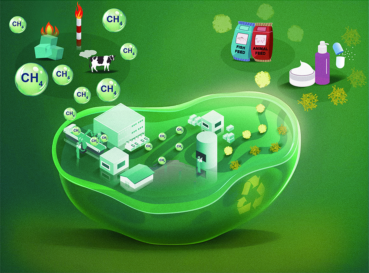 甲烷是一种强温室气体,其全球变暖潜能值远超CO2。甲烷气体主要来源包括化石资源开采、煤矿伴生气、水稻田以及厌氧发酵过程产生的沼气。目前甲烷主要应用方式是燃烧生热能,其利用方式单一,且转化过程碳原子经济性低下。随着全球人口的增长和气候恶化的加剧,蛋白、多糖原料等必需食品供需紧张。微生物蛋白作为一种优质的替代蛋白来源,显示出巨大的潜力。利用甲烷这种温室气体作为生物制造原料,不仅可实现资源的有效利用,还能有效缓解“与人争粮,与粮争地”的紧张局面,对于可持续发展具有重要意义。