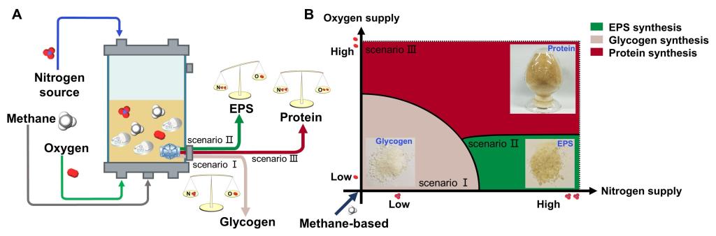 费强教授团队创新性地提出了利用微生物转化甲烷气体合成高价值大分子产品的新策略。他们成功开发了针对嗜甲烷菌细胞工厂高效合成细胞蛋白和多糖聚合物的高密度发酵技术,并深入解析了细胞工厂中碳氮代谢流的协同适配机制。该研究首次引入基于氮氧营养的可控性诱导策略,通过人工定向强化,显著提升了特定产物的生产效率。这一策略实现了甲烷到大分子产品的高效一步转化,为甲烷的高价值利用和新质生产力的发展开辟了全新的道路。