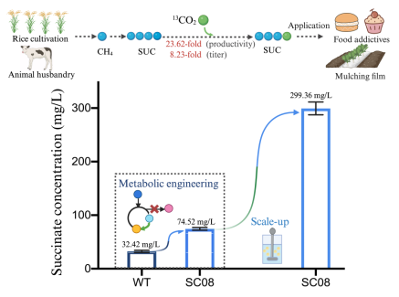 甲烷(CH4)和二氧化碳(CO2)是导致全球气候变暖的主要温室气体,它们的排放量与温室效应紧密相关。为了应对能源使用活动产生的温室气体排放导致的全球气候变暖问题,全球学术界和产业界越来越重视CH4CO2的捕获与利用。通过先进的生物制造技术和合成生物学技术,可以利用微生物有效地固定这些温室气体,这不仅能够显著减少温室气体的排放,而且可以将沼气、煤矿瓦斯、废弃天然气(如页岩气)转化为高价值的化学品,这对于实现中国的碳中和目标和能源的高效综合利用具有重大意义。琥珀酸作为一种重要的二元羧酸,在医药、可降解塑料和食品添加剂的生产中有着广泛的应用。因此,利用CO2CH4作为原料生产琥珀酸,可以减少对化石资源的依赖,拓展生物制造的原料来源,并推动国家的绿色可持续发展。