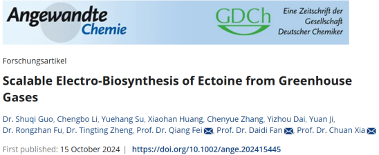 该研究成果以《可扩展电化学-生物催化耦合系统实现从温室气体合成依克多因》(Scalable Electro-Biosynthesis of Ectoine from Greenhouse Gases)为题,发表在国际顶尖学术期刊《德国应用化学》(Angewandte Chemie International Edition)上。厕所偷拍