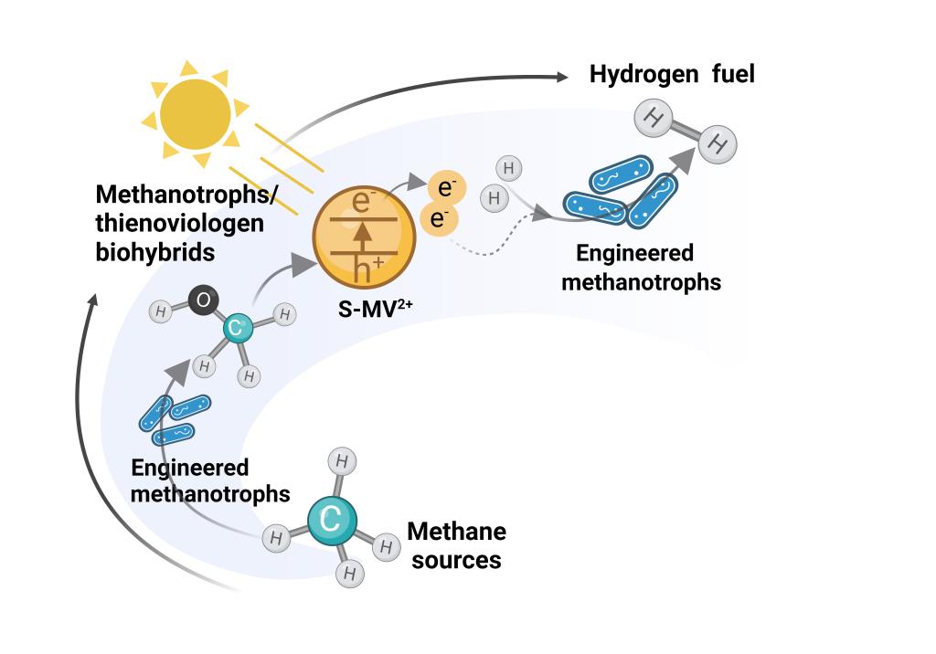 科研团队提出将光驱动体系应用于嗜甲烷菌细胞工厂,构建了一种全新的生物杂化体系,通过光电转换为细胞电子传递体和代谢途径传递还原力,有效增强了甲烷的生物利用效率。科研团队开发了嗜甲烷菌和光敏剂的原位耦合催化系统,实现光生电子强化胞内还原力供给,并基于牺牲剂生物合成设计自激活策略,增强甲烷生物利用和氢气生产效率,为推动可再生能源高效利用和实现“双碳”目标提供了一条创新途径。