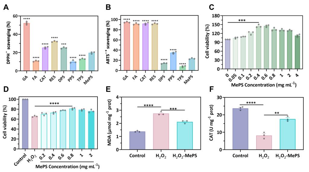 为深入研究甲烷基多糖的生物活性方面,研究团队开展了化学测试和细胞验证实验。结果显示,甲烷基多糖的自由基清除能力显著高于阿魏酸以及石斛、茯苓、银耳等天然植物源多糖。巨噬细胞培养实验进一步证明,添加甲烷多糖不仅能促进正常细胞的增殖,还可以通过降低脂质过氧化物含量和修复抗氧化酶活性,将氧化损伤胁迫下细胞的存活率提高近20%(图2)。这一结果有力地证明了甲烷基多糖具高抗氧化活性,为其在生物医用材料领域应用奠定基础。相关研究成果已发表于国际知名期刊《Journal of Agricultural and Food Chemistry》,厕所偷拍